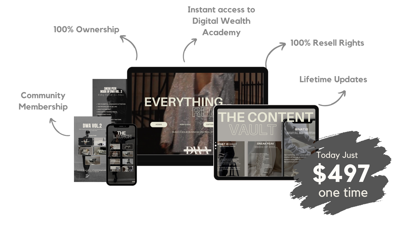 Inside DWA, you'll gain access to 6 PLR products for 100% profit, a Content Vault with new marketing materials every two weeks, and live weekly training calls.